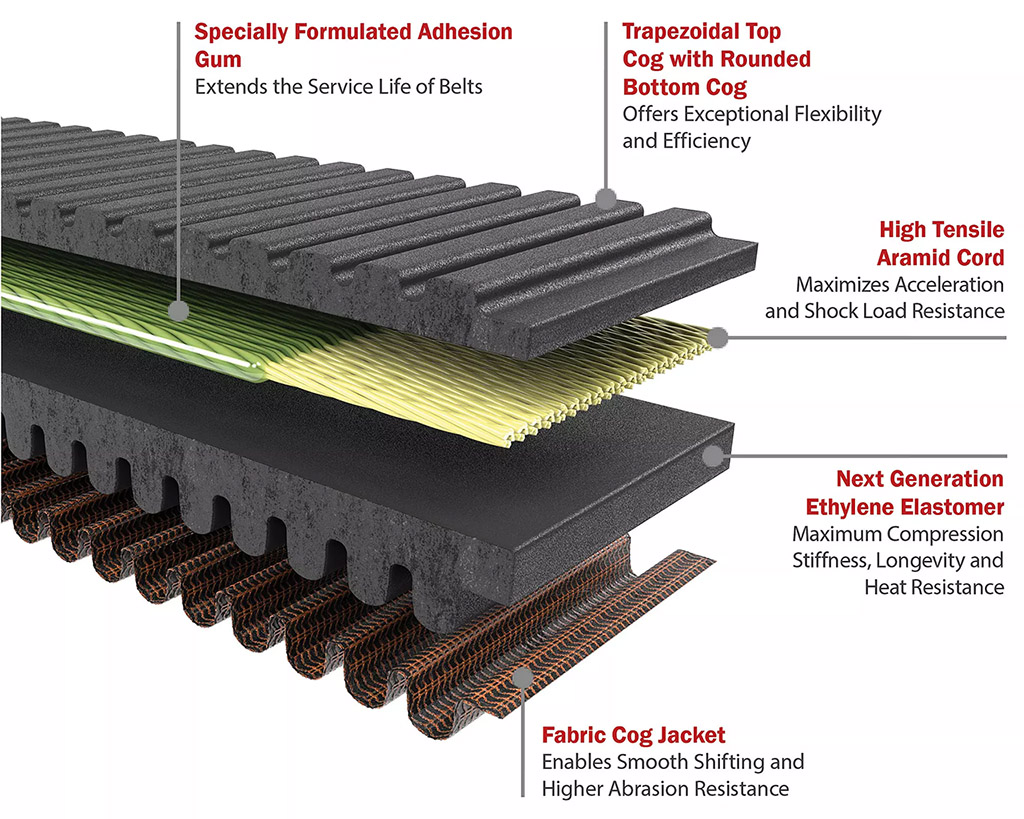 Gates G-Force™ RedLine™ CVT Belts are engineered from a patented, fiber-reinforced Ethylene Elastomer compound, providing maximum transverse stiffness and unmatched heat resistance which allows for increased durability, greater load-carrying capability and a higher effective operating temperature.